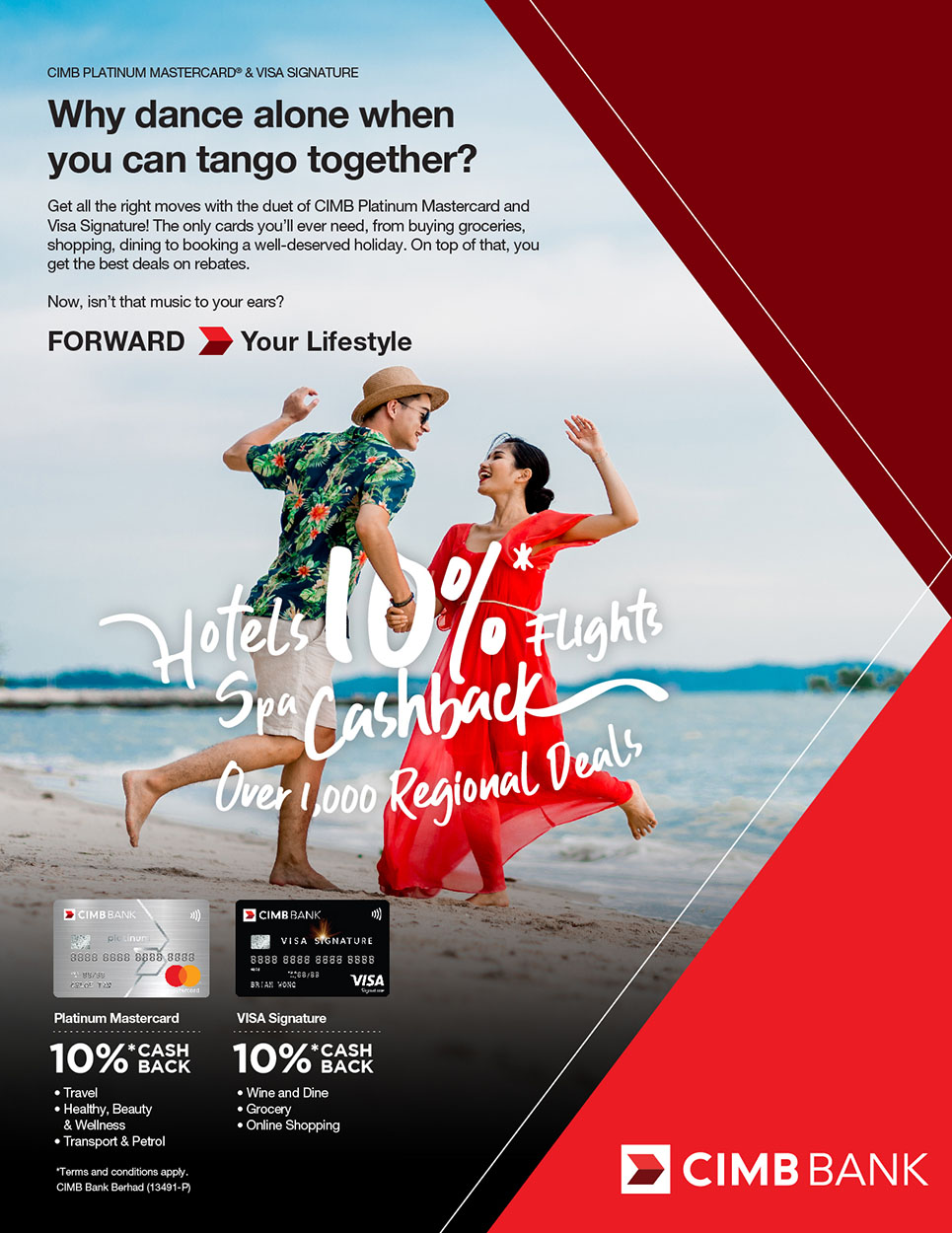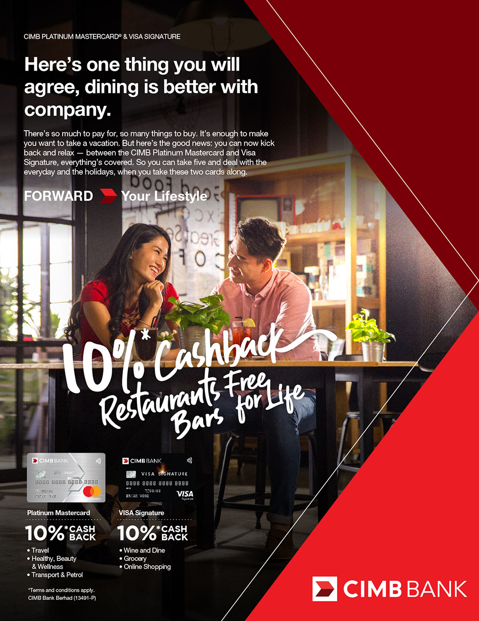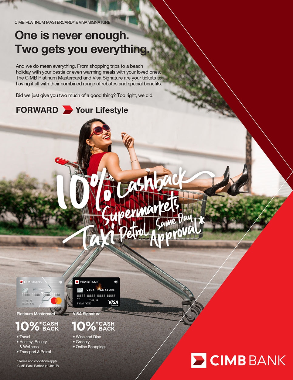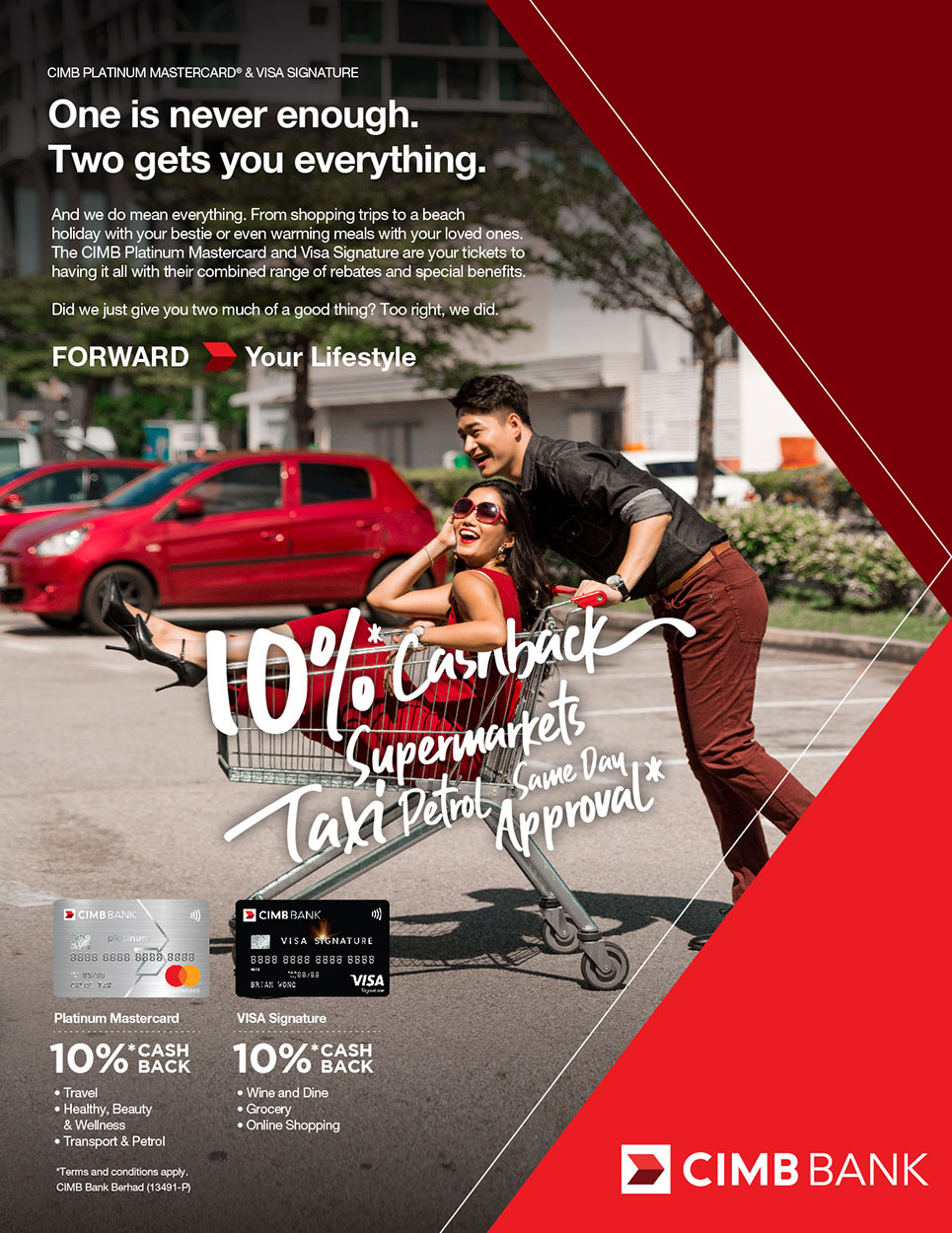 Most cardmembers would prefer to cut one credit card and keep the other. This is why CIMB Credit Cards is revamping the cash rebate structure of its mass cards – Platinum MasterCard and Visa Signature to encourage the usage of two cards. Cardmembers are now allowed to earn and save more when they use two cards in different categories. A TVC, several print ads, and a new card face design was proposed to market this new feature.